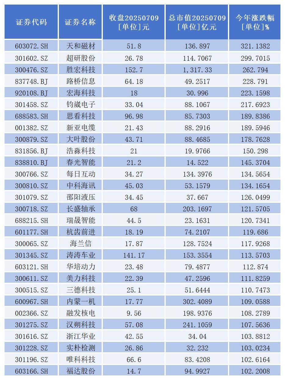 从二级市场表现看,今年以来,A股机器人概念板块已诞生29只**股,其中,天和磁材、超研股份、胜宏科技、路桥信息、宏海科技、钧崴电子涨幅均超过200%。