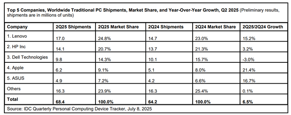 快科技7月9日消息,根据国际数据公司(IDC)数据显示,2025年第二季度全球PC市场延续增长态势,个人电脑出货量达6840万台,同比增长6.5%。