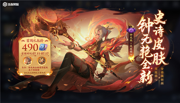 一同到来的还有钟无艳全新史诗皮肤“戍鼓铭心”,钟无艳化身为一位戍边卫境的凤鸣军女将,该皮肤将于7月11日0点上架,首周礼包价490点券(相当于49元)。