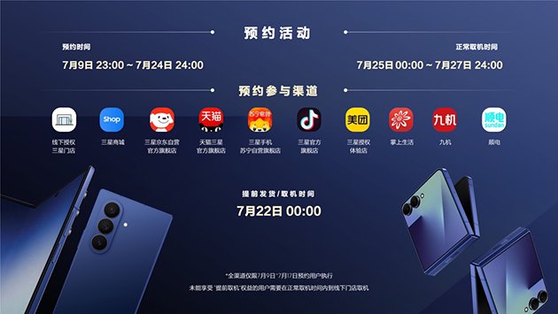 三星Galaxy Z Fold7将于7月9日23:00,在三星商城、三星京东自营官方旗舰店、天猫三星官方旗舰店、三星手机苏宁自营旗舰店、抖音三星官网旗舰店等线上渠道以及线下授权三星门店正式开启预约,并于7月25日全渠道正式开售。三星Galaxy Z Fold7提供暗影蓝、星夜银、秘影黑 以及青霜绿(三星商城专属颜色) 四种配色,厂商建议零售价13999元起。成功预约三星Galaxy Z Fold7的消费者,可有机会享受免费升杯(256GB升级至512GB)、加价1250元升杯(512GB升级至1TB)购机福利, 7月17日前成功预约的消费者还可享有提前发货权益。