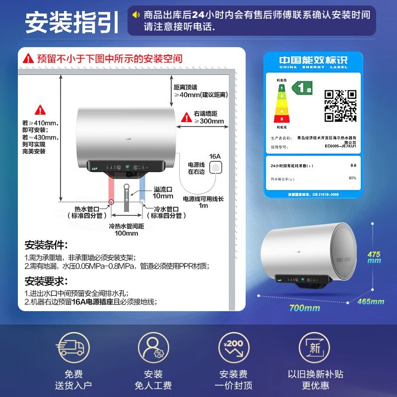 海尔60升电热水器EC6005 - JE7KU1优惠价1839元