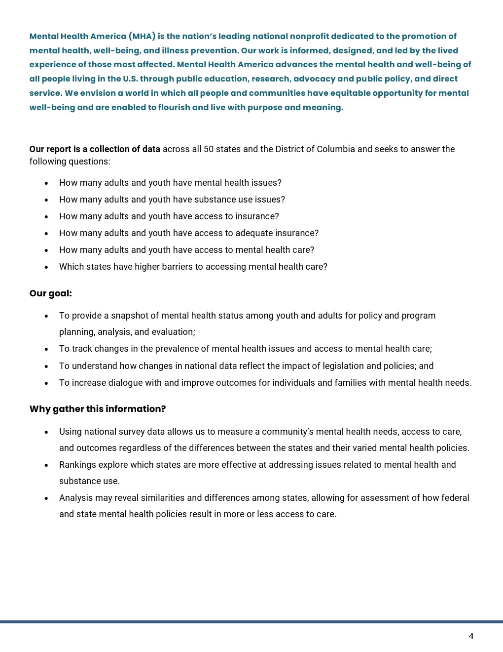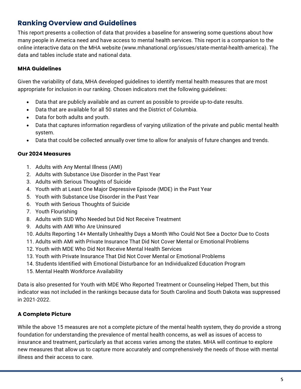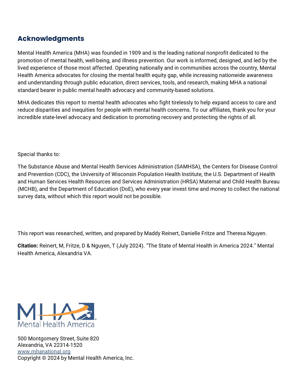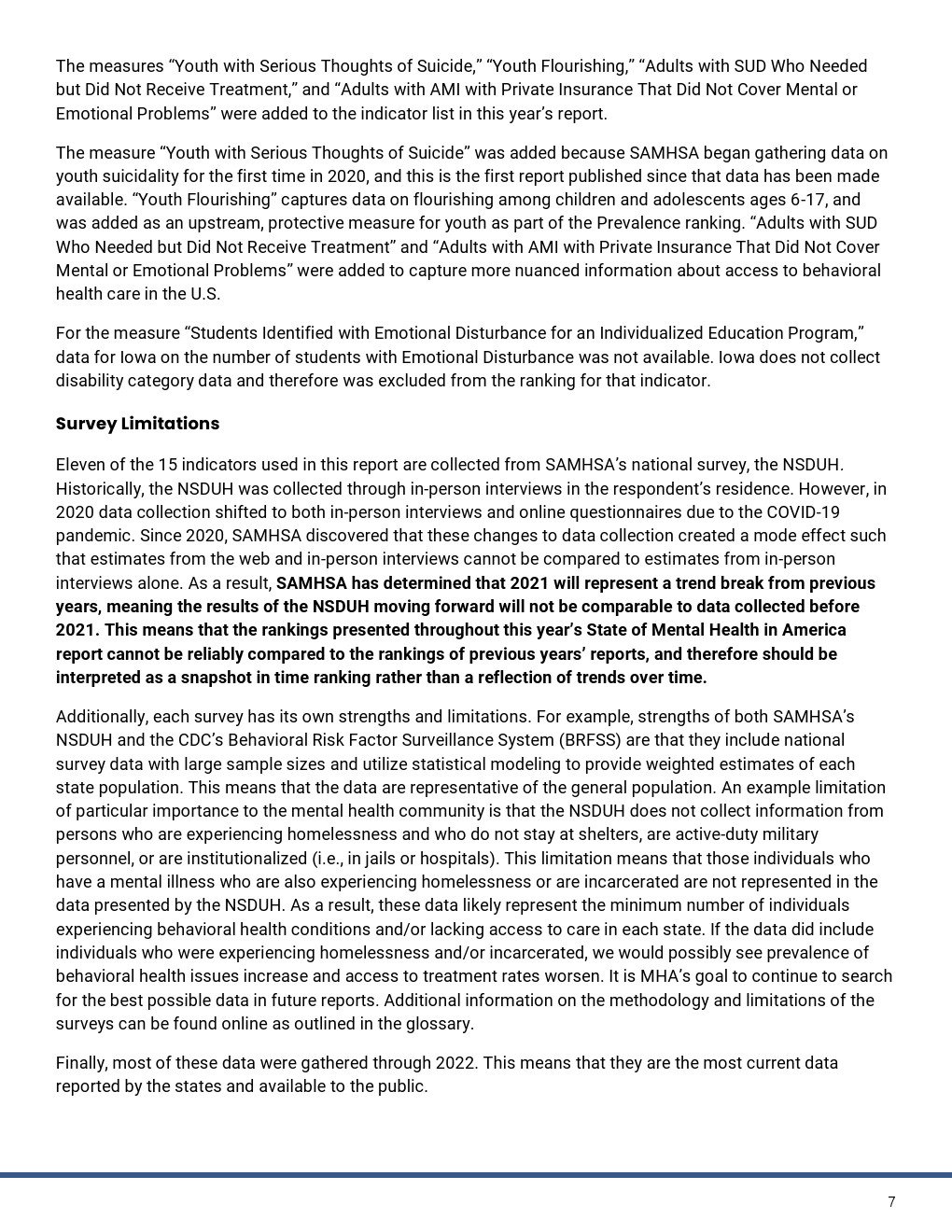 COVID-19大流行严重影响了2020年国家监测数据的收集能力。在此期间,联邦机构更新了收集指标及其收集方式。因此,本年度的“美国心理健康状况报告”中的指标无法与往年进行比较。
