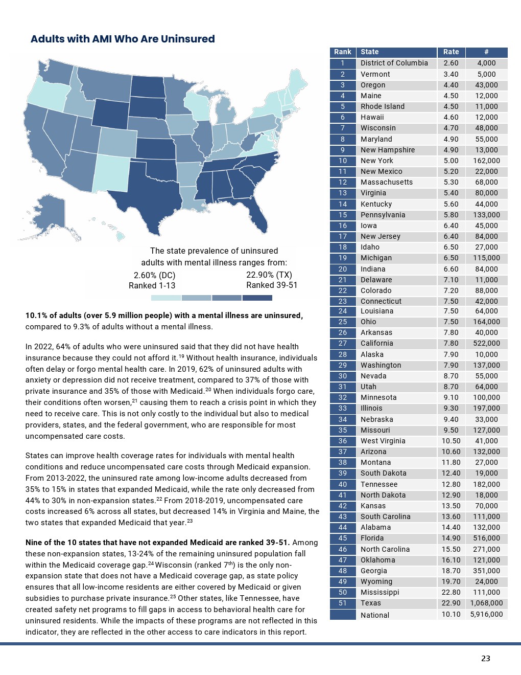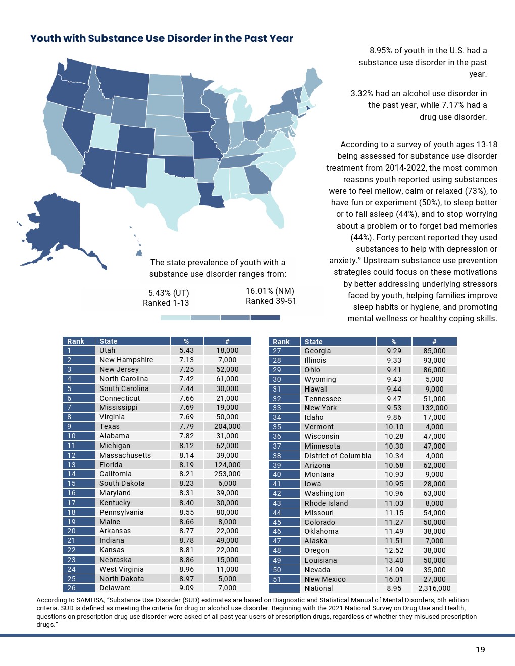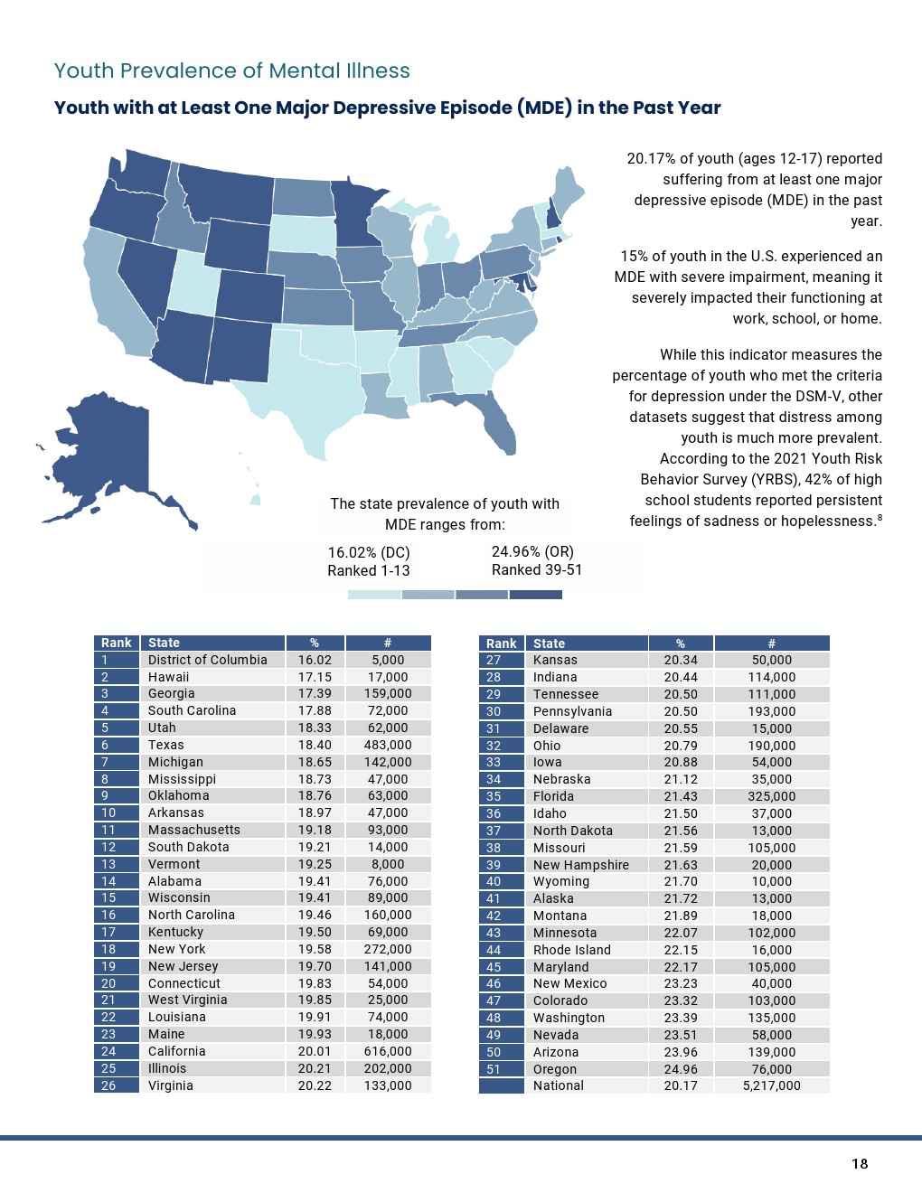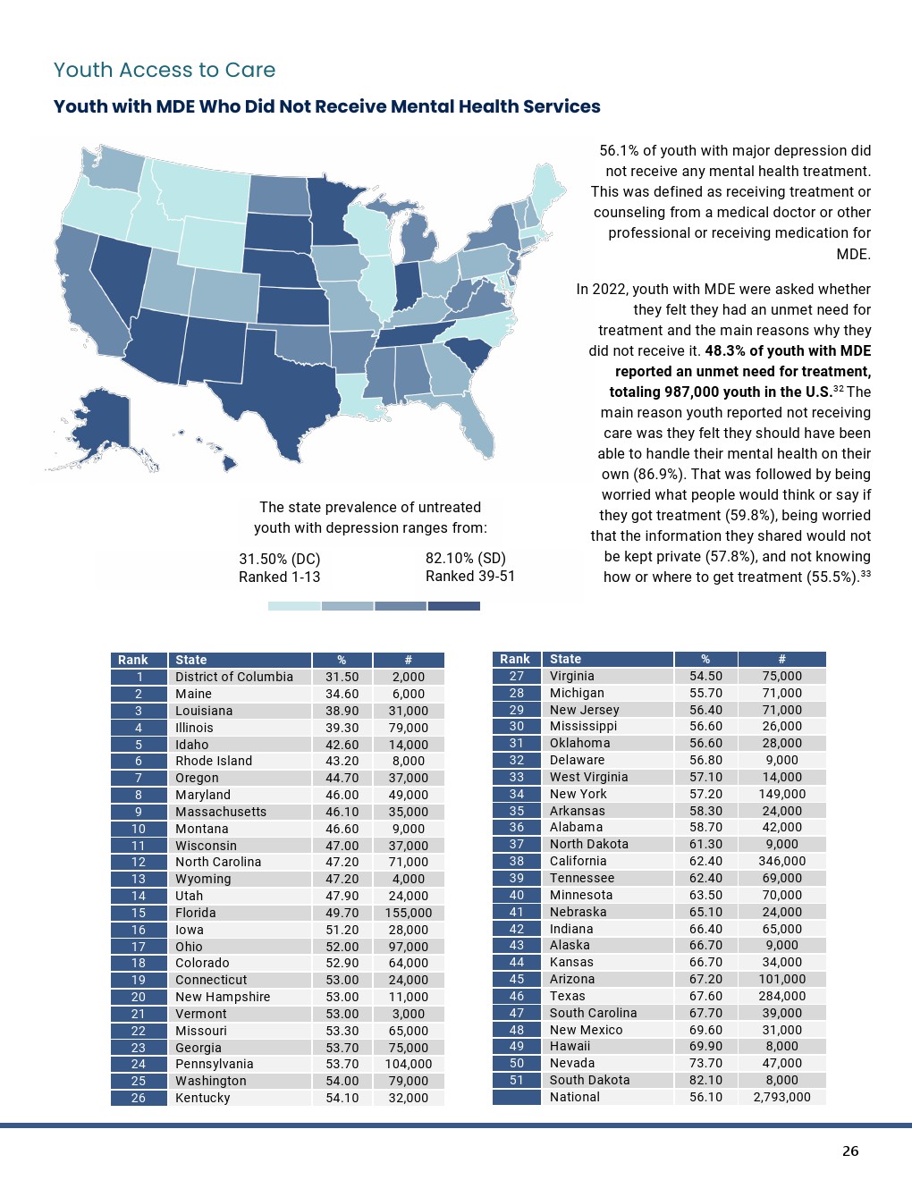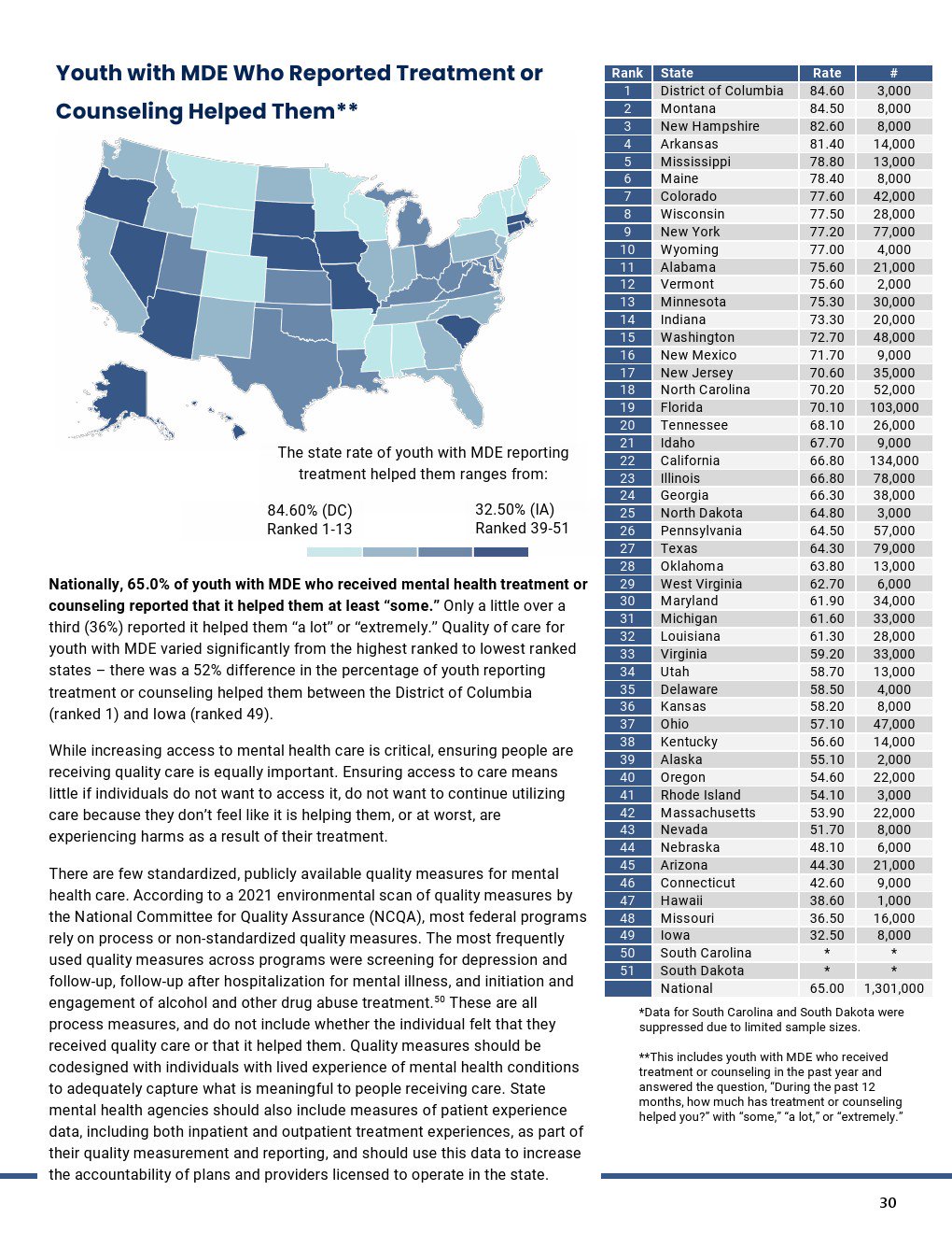 这些指标均使用药物滥用与心理健康服务管理局(SAMHSA)的全国药物使用与健康调查(NSDUH)数据计算。移除”患有严重MDE的青少年”指标是因为其与”过去一年至少有过一次MDE的青少年”指标无显著差异。2022年,SAMHSA对心理健康和物质使用治疗问题进行了修改。本报告依赖州级数据,这些数据仅以两年配对形式提供。2022年心理健康治疗指标的变更意味着数据集与2021年指标不可比,无法合并为两年配对数据。待2022-2023年NSDUH数据公布后,这些指标可能于明年报告中恢复。
