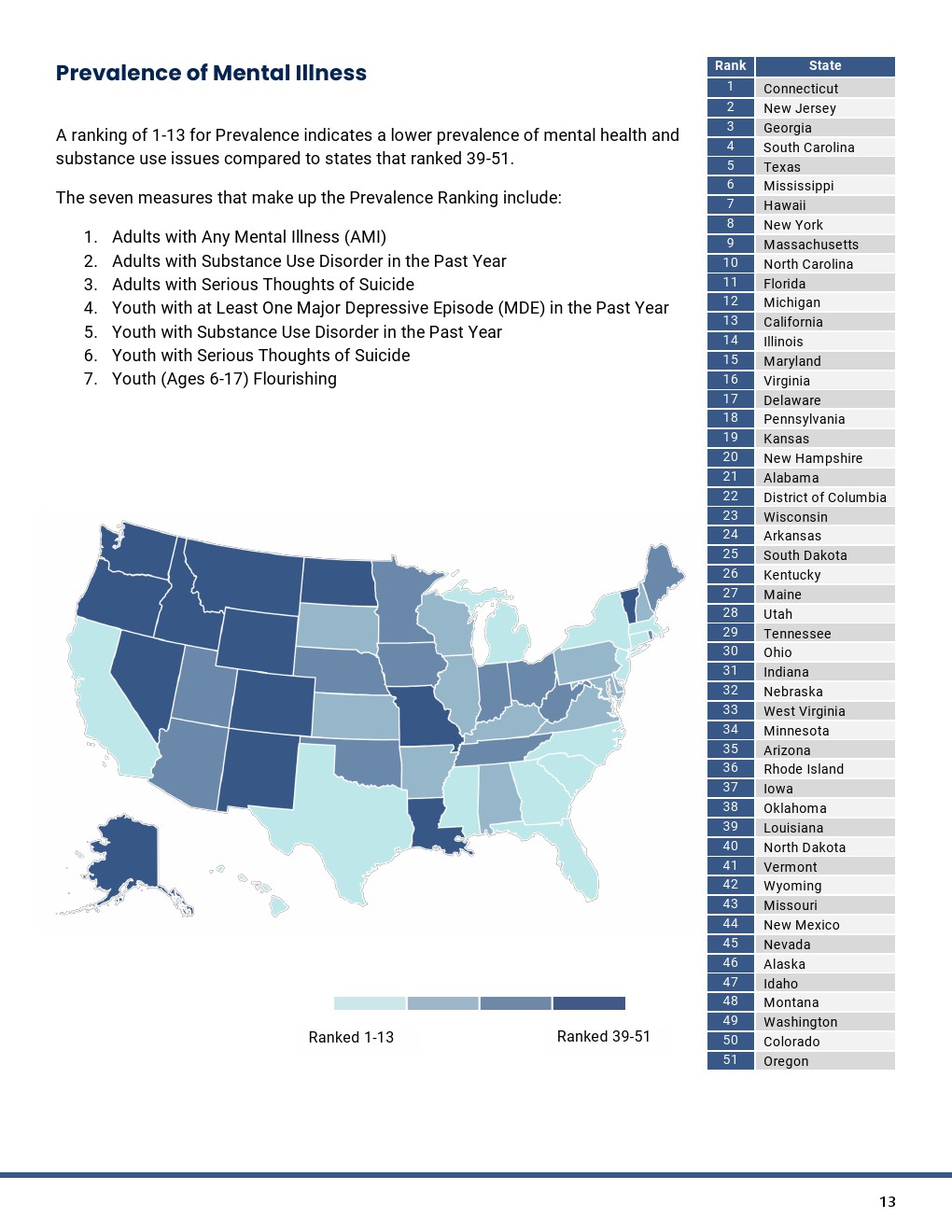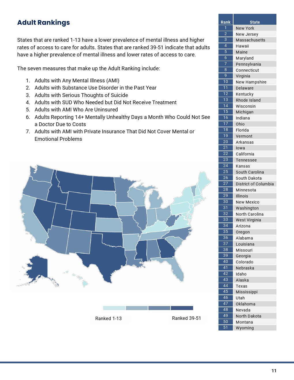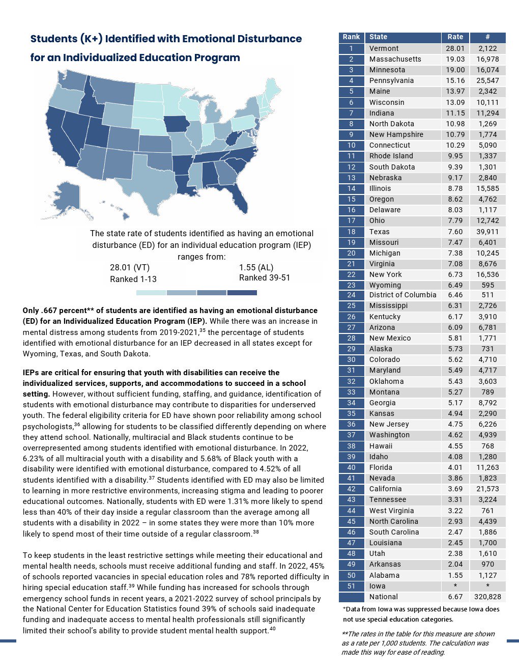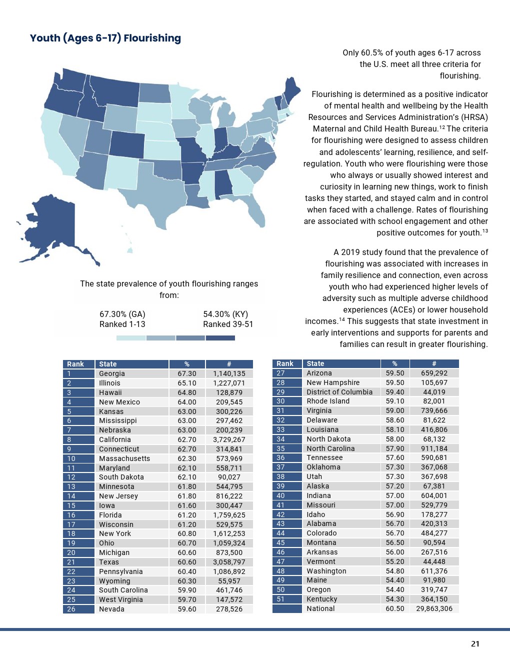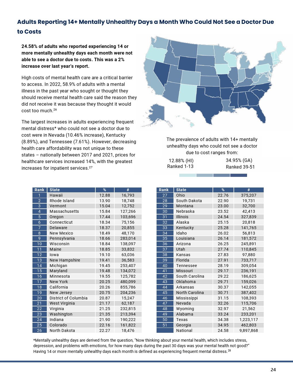 这些指标均使用药物滥用与心理健康服务管理局(SAMHSA)的全国药物使用与健康调查(NSDUH)数据计算。移除”患有严重MDE的青少年”指标是因为其与”过去一年至少有过一次MDE的青少年”指标无显著差异。2022年,SAMHSA对心理健康和物质使用治疗问题进行了修改。本报告依赖州级数据,这些数据仅以两年配对形式提供。2022年心理健康治疗指标的变更意味着数据集与2021年指标不可比,无法合并为两年配对数据。待2022-2023年NSDUH数据公布后,这些指标可能于明年报告中恢复。