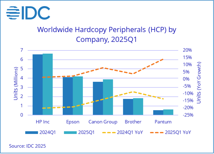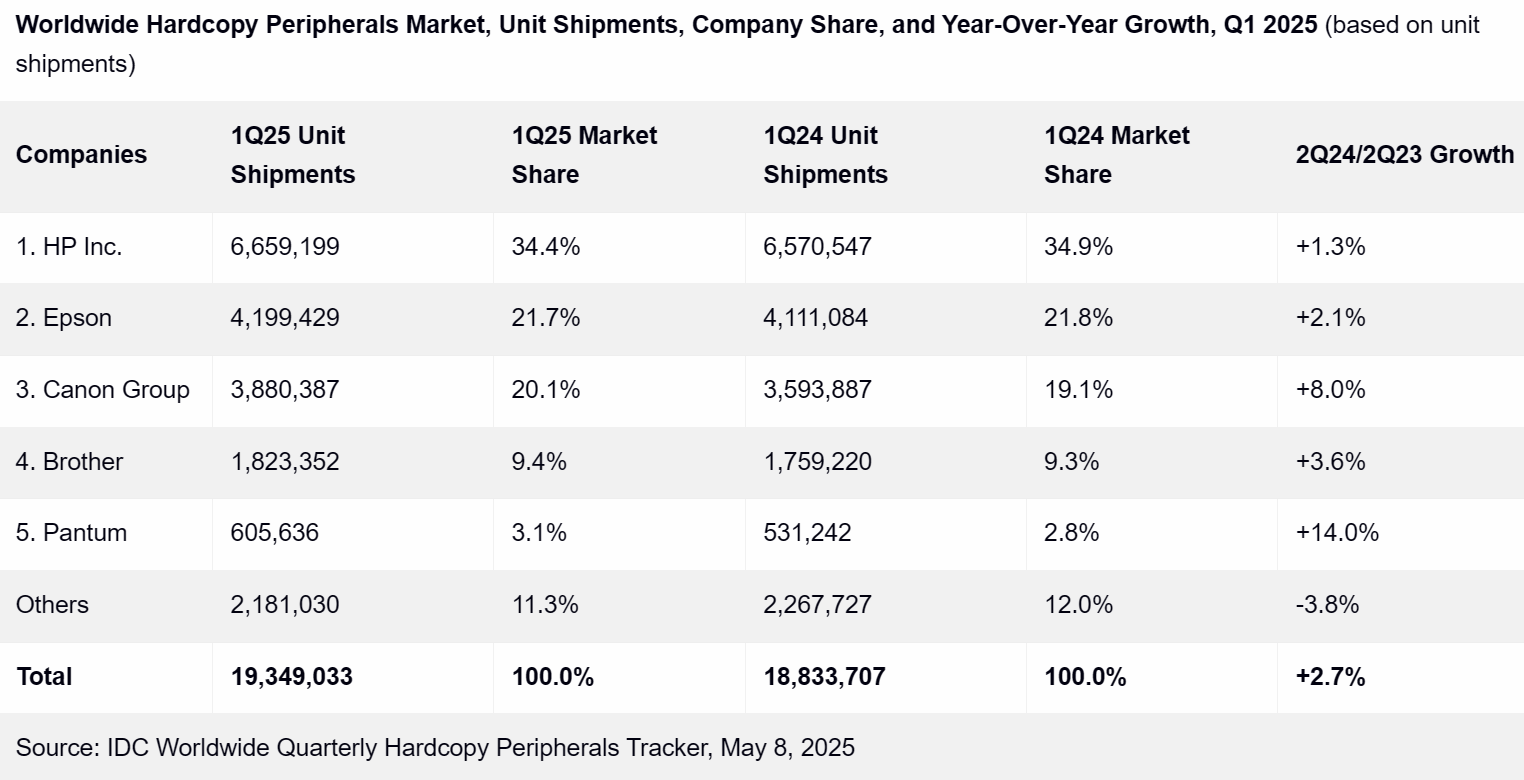 根据IDC的数据,2025年第一季度全球打印外设(HCP)市场连续第三个季度实现同比增长,出货量增长2.7%,达到约1940万台。但出货价值同比下降3.2%,约达到90亿美元。