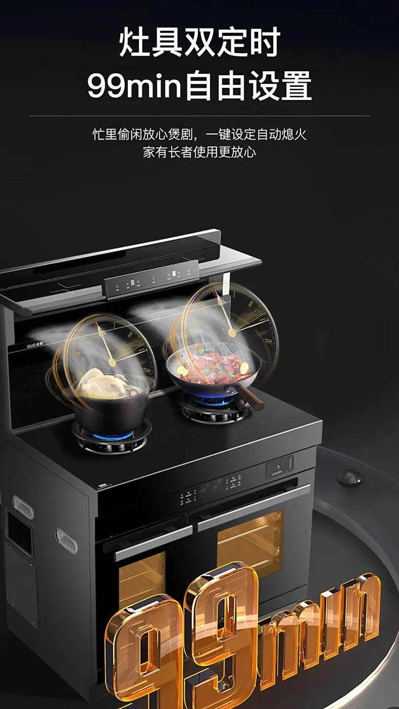 佳歌A3DZK集成灶搭载“双灶定时” 功能,99min可自由设置,一键设定自动熄火,规避隐患,保障厨房安全。