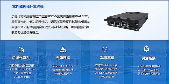 针对传统课堂 “重结果轻过程” 的痛点 —— 仅以成绩评判效果、人工听评课低效且干扰教学、过程性数据缺失导致干预滞后、教师培训缺乏精准性,系统以硬核技术实现突破:搭载 20Tops 算力的 RISC-V 架构 AI 算力盒,支持 32 路 1080P 视频实时解码与本地边缘计算,通过双摄像头 + 拾音器无感采集音视频,本地存储保障隐私;融合计算机视觉与自然语言处理技术,精准识别教师 10 + 类授课行为、学生 8 + 种学习状态,同步解析语速、高频词等 6 + 类语音数据,构建课堂数据 “全维度画像”,织就数据采集 “天罗地网”。