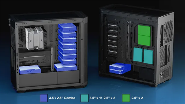 如图所示,机箱配备了11个硬盘仓位,支持3.5英寸和2.5英寸硬盘的自由组合,还有一个支架提供1个3.5英寸或2个2.5英寸硬盘仓位,后置主板托架位置可以固定2个2.5英寸硬盘。