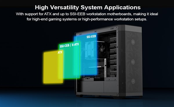 此外该机箱还提供188毫米的CPU散热器高度、8个扩展槽以及220毫米的电源长度,支持从Mini-ITX到E-ATX的各种主板规格。