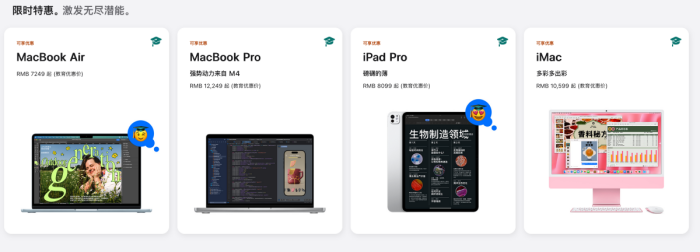 目前参与返校季促销的Mac设备包括:MacBook Air 系列、MacBook Pro 系列以及 iMac 系列,涵盖了当前苹果笔记本和一体机的主力阵容。今年发布的多款M4芯片新品也已同步上架教育商店,起售价分别为:MacBook Air(M4)7249元起、MacBook Pro(M4)12249元起、iMac(M4)10599元起。其中,MacBook Air默认提供16GB内存 + 256GB 存储的基础配置,若需更大容量,可按官网提供的配置选项灵活加价定制。