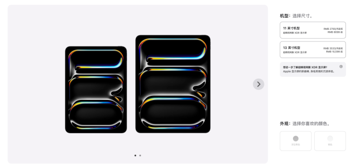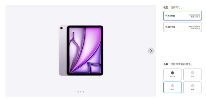 此次参与返校季促销的iPad Air(M3)提供11英寸与13英寸两种尺寸,均支持Wi-Fi和蜂窝数据两种连接方式。其中,11英寸Wi-Fi版本起售价为4399元,提供128GB、256GB、512GB与1TB四档容量,对应售价分别为4399元、4899元、6599元和7899元。13英寸Wi-Fi版本则起售价为6099元,同样提供四种容量配置,售价分别为6099元、6599元、8299元与9599元。蜂窝版本可额外加配,价格为1300元,同时AppleCare+服务也可选购,11英寸版本售价599元,13英寸版本售价699元。
