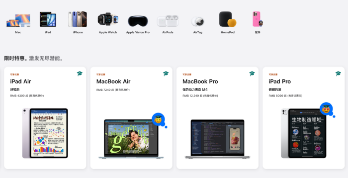 整体来看,2025年的返校季在优惠结构上依旧延续了“教育价 + 赠品”的经典组合,覆盖了苹果主力的生产力设备线。但相比往年,今年的适用产品范围略有收紧,变化最为明显的体现在Mac系列上。此前持续参与返校季活动的Mac mini系列已被移出优惠名单,今年仅剩MacBook Air、MacBook Pro与iMac三大产品线可享教育赠礼政策,削减了桌面级设备用户的可选空间。