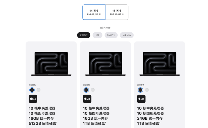 相比之下,MacBook Pro 系列提供了更丰富的性能配置,用户可根据自身需求,选配Apple Silicon M4、M4 Pro或M4 Max芯片版本,进一步拓展性能上限,满足从学习办公到专业创作的多种用途需求。