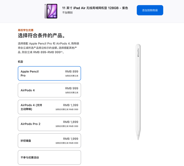 在赠品选择方面,今年返校季首次在iPad产品线上引入了更丰富的“配件任选”模式。符合活动条件的用户,在购买iPad Air(M3)或iPad Pro(M4)后,可从两款高价值配件中任选其一作为赠品,分别为:Apple Pencil Pro或 AirPods 第四代(普通版)。如果用户希望选择更高规格的配件,也可通过加价方式进行升级:选择AirPods 第四代(降噪版)需加价400元,选择AirPods Pro 第二代需加价900元,升级为妙控键盘则需加价1100元。