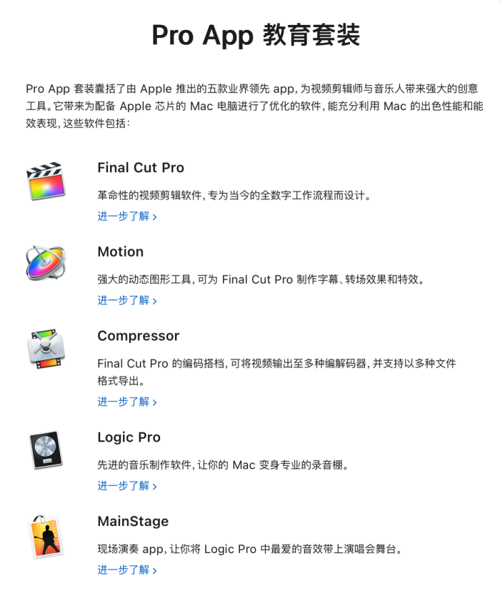 此外,苹果也为教育用户提供了极具性价比的软件套装选购方案,包含五款核心生产力工具:Final Cut Pro、Motion、Compressor、Logic Pro 和 MainStage,组合售价仅为1298元。该套装几乎覆盖了音视频剪辑、音乐制作和舞台控制等创作场景,特别适合传媒类专业、艺术专业或有专业创作需求的师生用户。