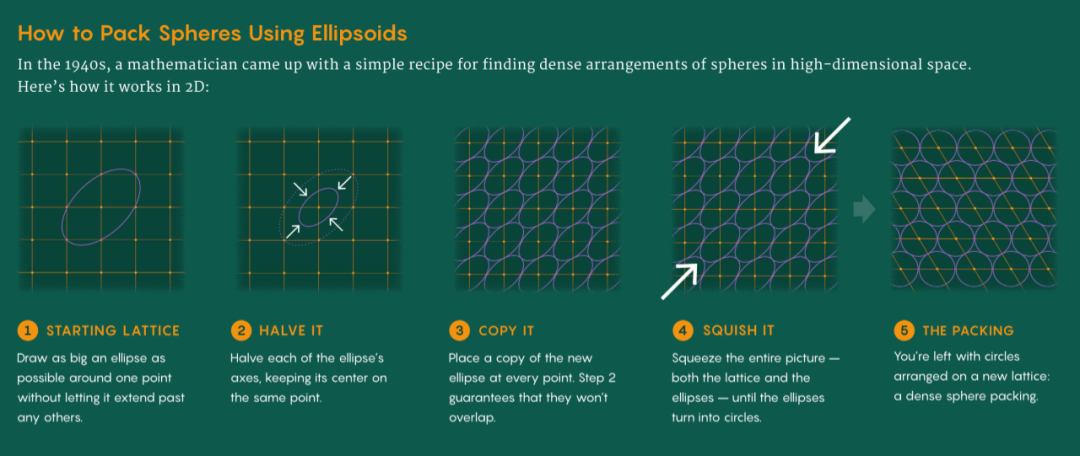 当他读到罗杰斯将椭球体变成球体堆积的技巧时,他想知道为什么数学家们放弃了这种方法。椭球体是凸形,所以 Klartag 知道很多复杂的方法来操作它们。他还意识到,罗杰斯使用的初始椭球体虽然直观,但效率低下。他只需构造一个更好的椭球体 —— 一个在边界与格中的其他点接触之前能够覆盖更大空间的椭球体 —— 就能创造新的填充记录。