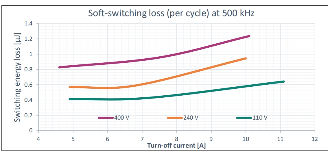 图7 500kHz开关频率下和三个不同输入电压下CoolGaN™ BDS 650V G5(IGLT65R055B2)的每周期软开关损耗