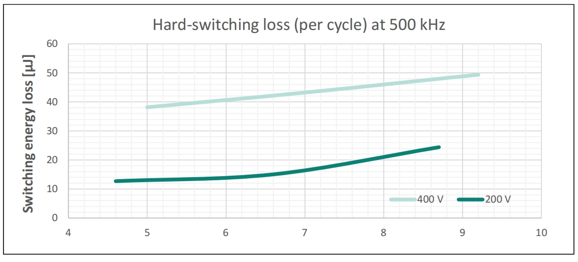 图6 500kHz开关频率下和两个不同输入电压下CoolGaN™ BDS 650V G5(IGLT65R055B2)的每周期硬开关损耗