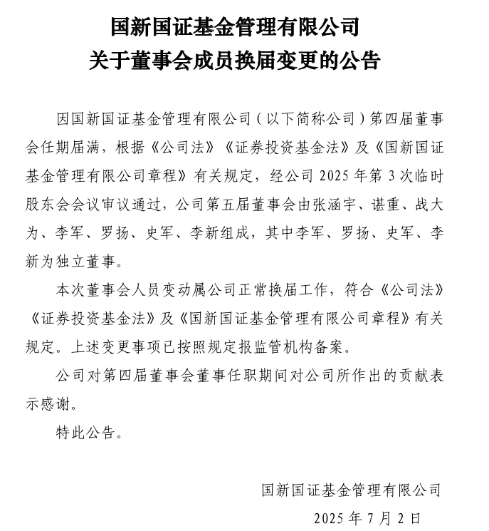 国新国证基金尽管未对董事长变更一事发布公告,但在7月2日发布了一则关于董事会成员换届变更的公告。公告显示,经公司2025年第3次临时股东会会议审议通过,公司第五届董事会由张涵宇、谌重、战大为、李军、罗扬、史军、李新组成,其中李军、罗扬、史军、李新为独立董事。上述变更事项已按照规定报监管机构备案。