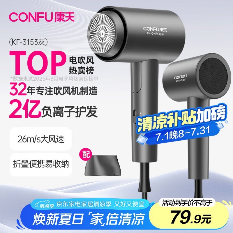 康夫电吹风机宿舍家用大风力小巧速干负离子护发折叠吹风筒仅35.5元