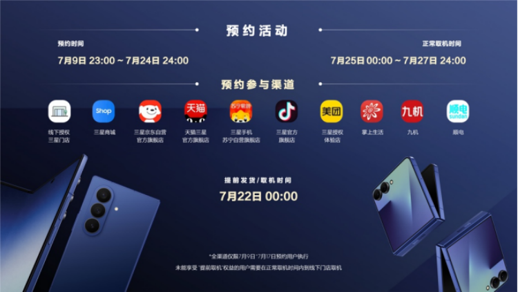 三星Galaxy Z Flip7将于7月9日23:00,在三星商城、三星京东自营官方旗舰店、天猫三星官方旗舰店、三星手机苏宁自营旗舰店、抖音三星官网旗舰店等线上渠道以及线下授权三星门店正式开启预约,并于7月25日全渠道正式开售。三星Galaxy Z Flip7提供秘影黑、暗影蓝、珊瑚红以及青霜绿(三星商城专属颜色)四种配色,厂商建议零售价7999元起;三星Galaxy Z Flip7 FE提供炫熠黑与炫羽白两种配色,厂商建议零售价6499元。成功预约三星Galaxy Z Flip7的消费者,可有机会享受免费升杯(256GB升级至512GB),7月17日前成功预约的消费者还可享有提前发货权益。