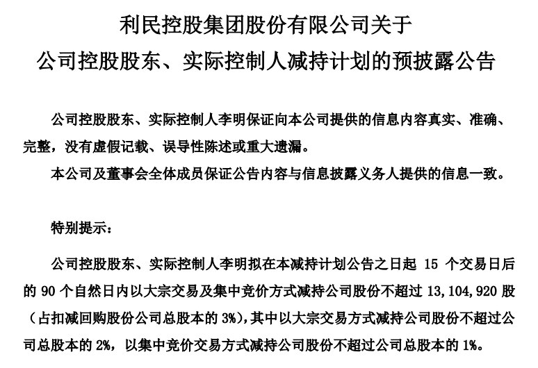 7月10日,利民股份发布公告,公司近日收到公司控股股东、实际控制人李明的《关于计划减持公司股份的通知》,李明拟在本减持计划公告之日起15个交易日后的90个自然日内以大宗交易及集中竞价方式减持公司股份不超过1310.49万股(占扣减回购股份公司总股本的3%)。减持原因系融资还款需求。