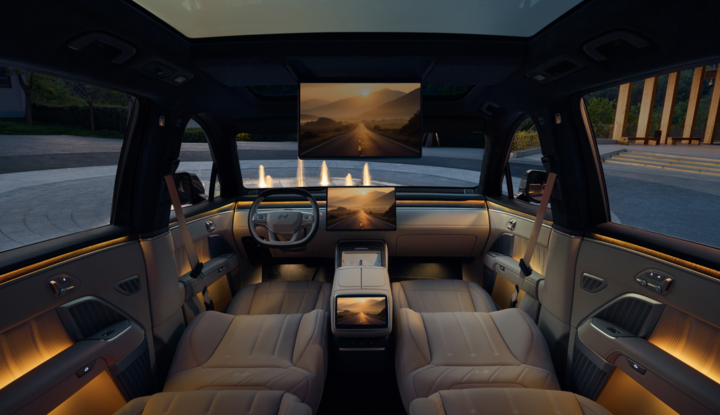 L90 在座舱内的其他舒适性配置上也堪称「拉满」,搭载了智能三驱空调、8.8L 智能冰箱、前后双天幕、全电动遮阳帘以及双层隔音玻璃、杜比全景声认证音响、1600 万色隐藏式氛围灯等。