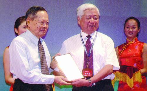 2007年,杨振宁为蒋民华(右)颁发求是杰出科技成就集体奖。