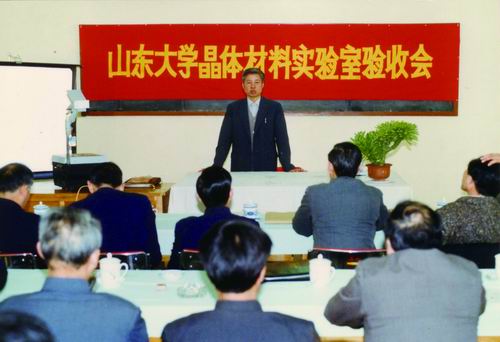 1987年,蒋民华在山东大学晶体材料实验室验收会上作报告。