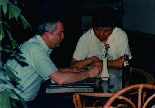 1988年,蒋民华(右)与美国杜邦公司的科研人员交流。