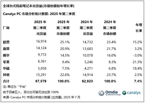 2025 年第二季度,全球 PC 出货量同比增长 7%,联想稳居榜首,苹果华硕表现亮眼!