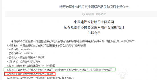 第一中标候选人为云南南天电子信息产业股份有限公司;第二中标候选人为深圳市紫金支点技术股份有限公司;第三中标候选人为中兴通讯股份有限公司。