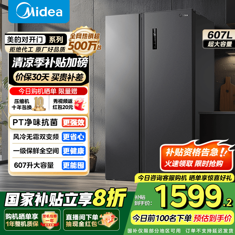 美的607升变频一级能效对开门冰箱限时特惠价1599元