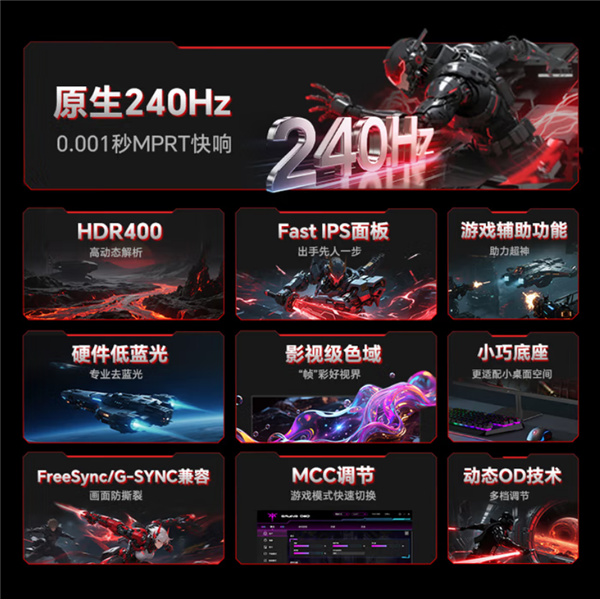 这款显示器配备了23.8英寸Fast-IPS面板,拥有1080P分辨率和240Hz的原生刷新率,响应时间1ms MPRT和2ms GTG。