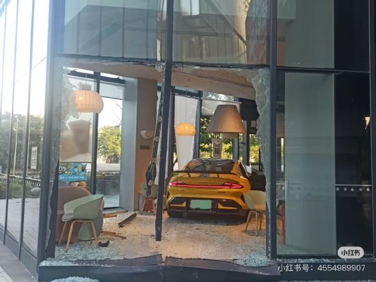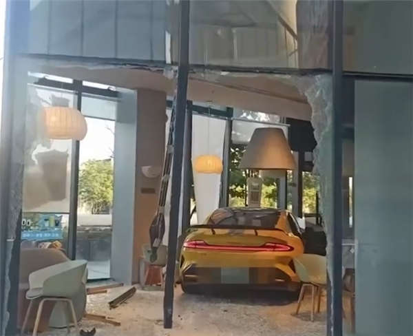 视频中显示,该门店玻璃破裂,碎片散落一地,一辆黄色的SU7 Ultra停在店内,头部受损。