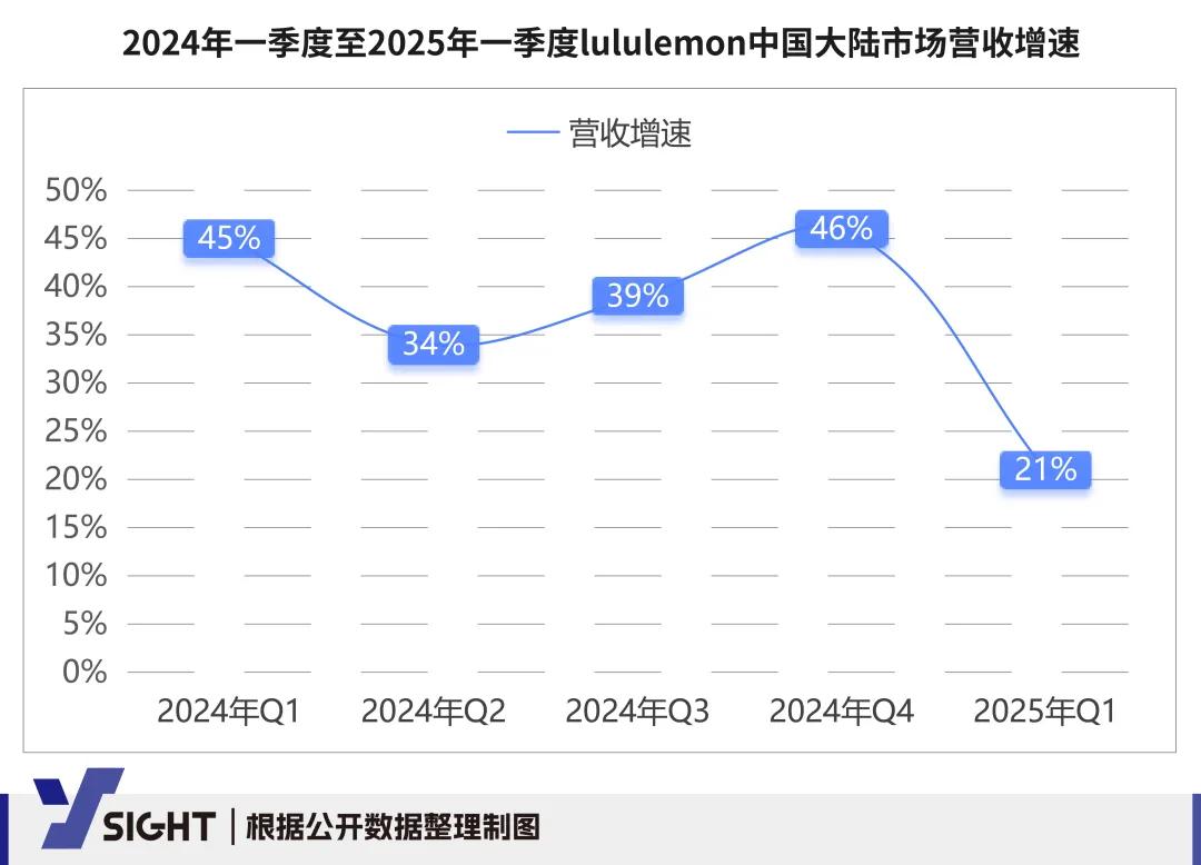 但lululemon的黄金增收引擎实际也在放缓。2024年一季度至2025年一季度,lululemon中国大陆市场单季营收增速分别为45%、34%、39%、46%、21%,呈波动下行趋势。