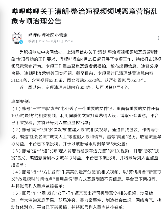 落实国家网信办部署要求,自“清朗·整治短视频领域恶意营销乱象”专项行动今年4月份启动以来,上海市网信办指导属地小红书、哔哩哔哩、得物、咪咕视讯、网易小蜜蜂等10余家短视频服务平台以及提供短视频功能的平台,发布治理公告,从严整治恶意虚假摆拍、散布虚假信息、违背公序良俗、违规引流营销等4类突出问题。