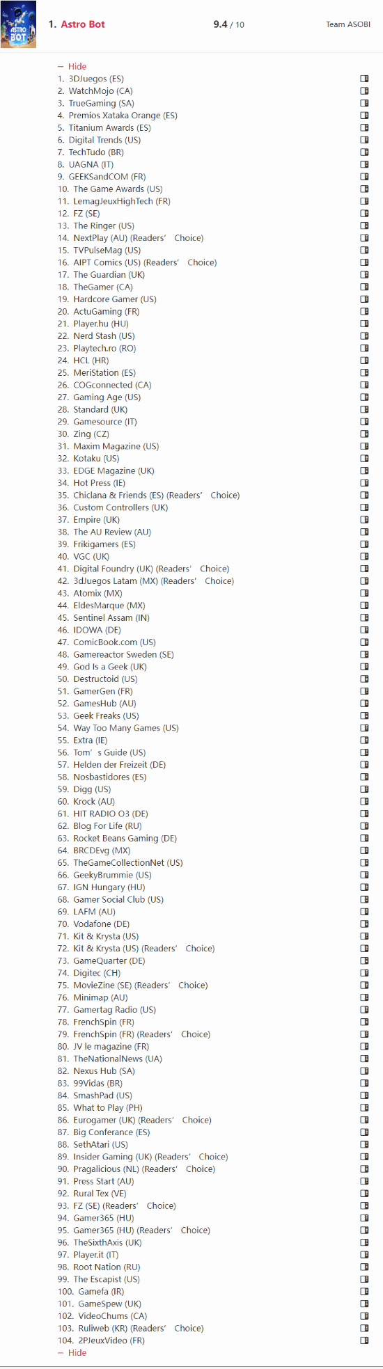 值得一提的是,根据GOTY Award Tracker网站的统计数据显示,《宇宙机器人》曾在2024年共获得了104次“年度最佳奖项”,成为有史以来获奖最多的“平台游戏”。