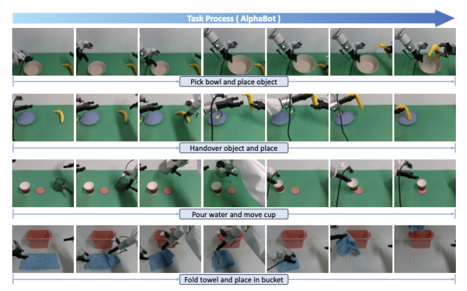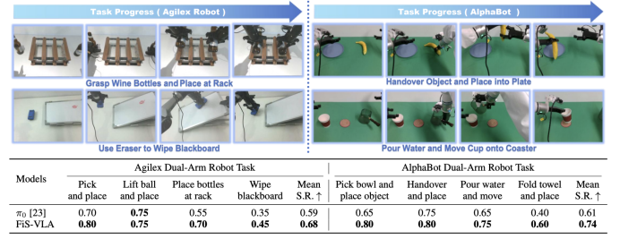 2. 真机测试:在真实机器人平台(Agilex 与 AlphaBot)中,FiS-VLA 在 8 项任务中平均成功率分别为 68% 与 74%,远超 π0 基线。在高精度操控任务如 “倒水”、“擦黑板”、“折毛巾” 等场景下展现显著优势。