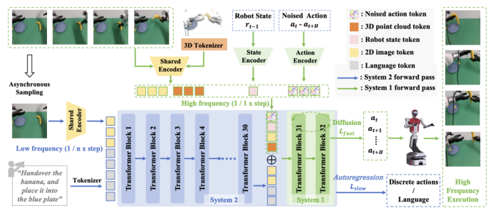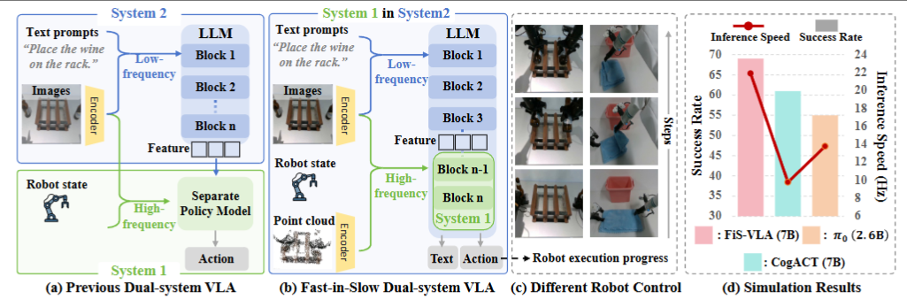 FiS-VLA 提出一种创新结构,将 VLM 的末端几层 Transformer 模块直接重构为系统 1 执行模块,嵌入原有系统 2 内部,形成一个统一的高效推理与控制模型。系统 2 以低频率处理 2D 图像和语言指令,输出指导特征;系统 1 以高频率响应实时感知输入(状态、图像和点云),实现高效动作生成。