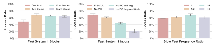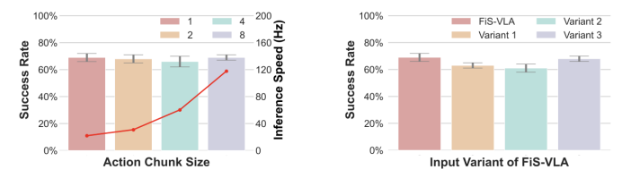 4. 消融实验:消融实验表明,并非共享 Transformer 层数越多,系统 1 性能越强,在共享 Transformer 层数为 2 的时候,FiS-VLA 实现最佳性能;系统 1 接收机器人状态、图像与点云三种输入模态效果最佳;系统 1 和系统 2 协作的最佳频率比为 1:4;FiS-VLA 在不同 action chunk 值下性能稳定,而控制频率呈比例提升。特别当单步预测 8 个动作时,理论控制频率高达 117.7Hz;同时最后作者还研究了 FiS-VLA 的一系列变体(模型输入的变体)。
