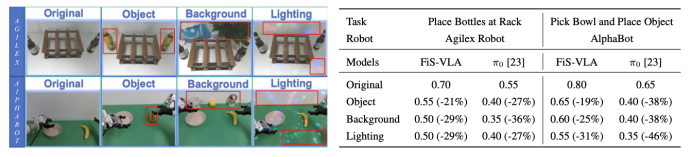 3. 泛化能力:在泛化测试中,面对未见物体、复杂背景与光照变化,FiS-VLA 准确率下降幅度远小于 π0,验证其双系统架构对视觉扰动的鲁棒性。