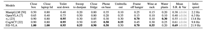 1. 仿真测试: FiS-VLA 在 RLBench 仿真任务中平均成功率为 69%,显著优于 CogACT(61%)与 π0(55%),在 10 项任务中 8 项居首。在控制频率上,其在动作块大小为 1 时达到 21.9Hz,是 CogACT 的 2 倍以上。