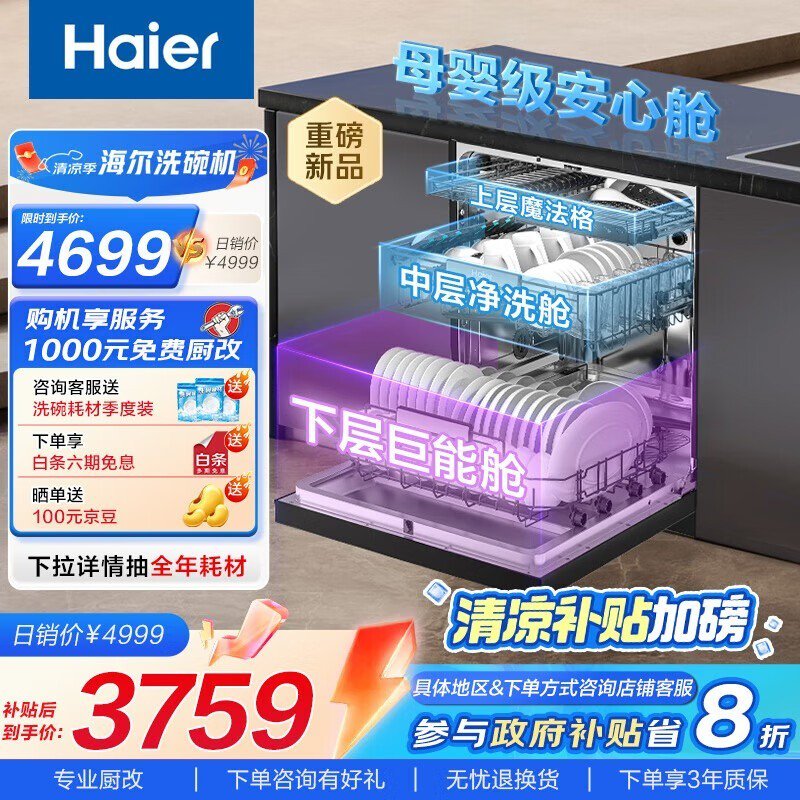 海尔双微蒸汽洗碗机18套大容量节能静音一级水效智能干燥优惠价3759.2