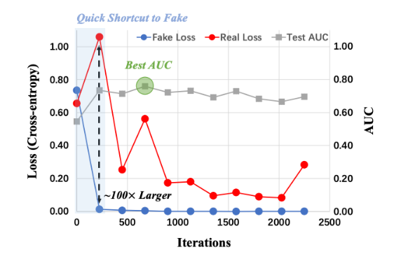 图1:真假二分类「不同于」猫狗分类等标准二分类,具有不对称性,即模型容易在很早期就快速过拟合到训练集的假类中(loss非常低),而真类此时基本完全没有学好(loss高)!