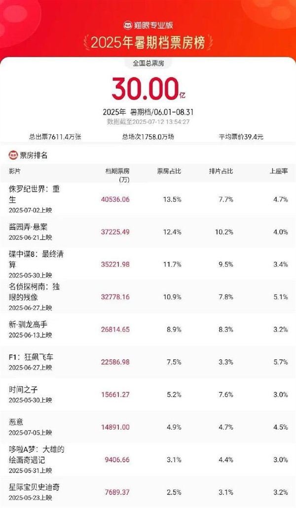 快科技7月12日消息,据猫眼专业版数据,截至今日13时54分,2025年暑期档总票房(含预售)破30亿。
