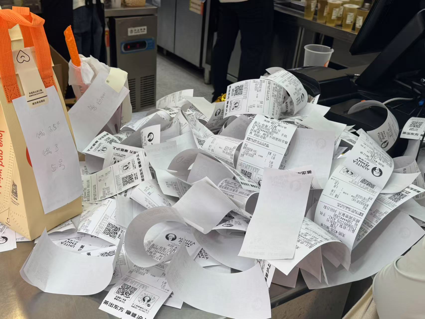 但跟一墙之隔的沪上阿姨比起来,库迪咖啡的忙碌是“小巫见大巫”。上午十点半,沪上阿姨已经排到了四百多杯,外卖单堆叠在操作台上如座小山,店员已经不再出新的订单纸。