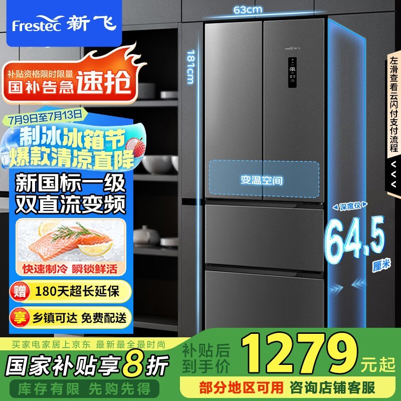 新飞风冷多门冰箱310L天穹灰,高效制冷除霜便捷