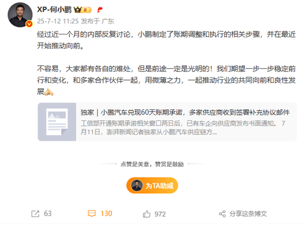 今天,小鹏汽车董事长何小鹏谈到了这个话题,他表示:“经过近一个月的内部反复讨论,小鹏制定了账期调整和执行的相关步骤,并在最近开始推动向前。”