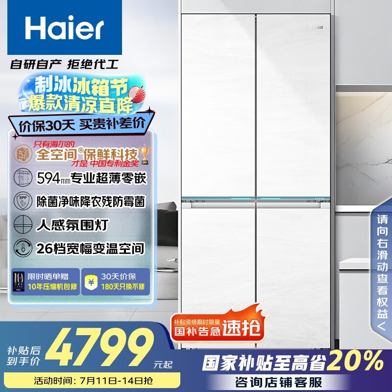 海尔Haier白巧系列475L超薄零嵌电冰箱限时特惠